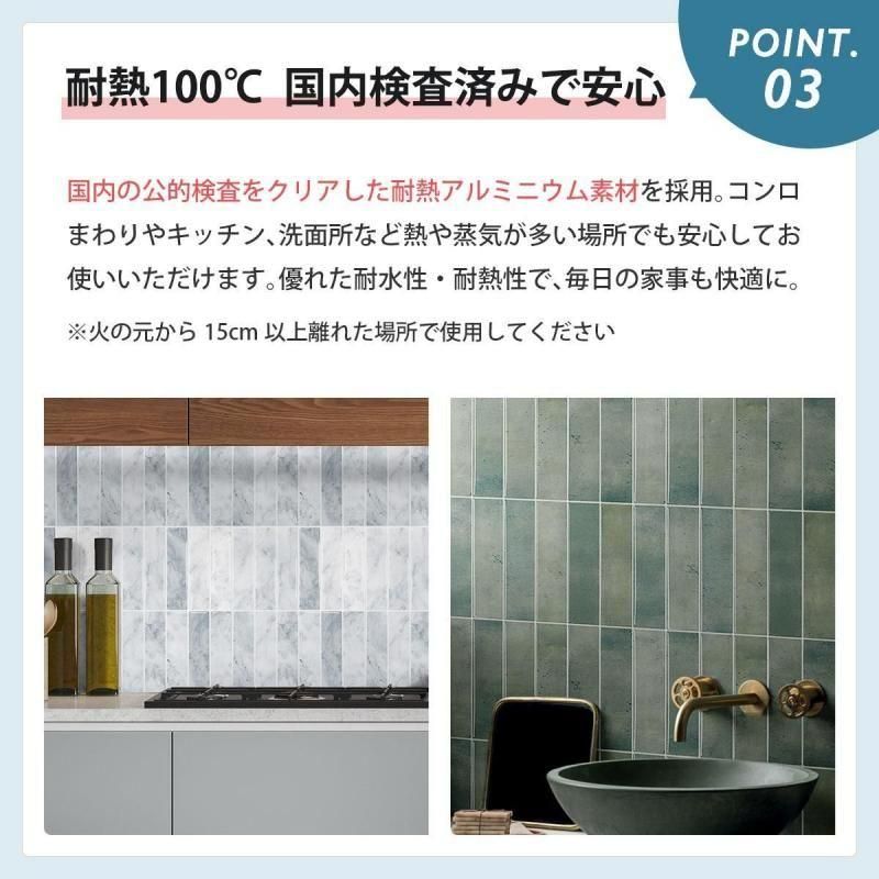 国内の公的検査をクリアした耐熱アルミニウム素材を採用。コンロまわりやキッチン、洗面所など熱や水はね、蒸気が多い場所でも安心してお使いいただけます。優れた耐水性・耐熱性で、毎日の家事も快適に。