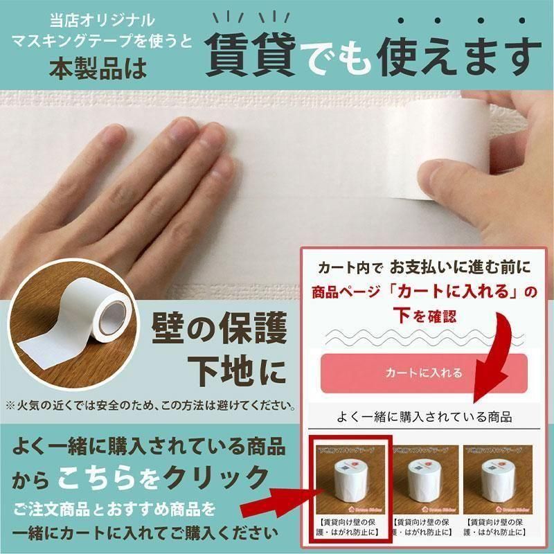 別売りの下地用マスキングテープを下地に使えば、賃貸のお部屋でも壁を傷めずきれいに剥がせます。特別な道具や接着剤は一切不要。台紙から剥がしてそのまま貼るだけ、サイズ調整もはさみやカッターで簡単にカットできるので、初めての方でも気軽にDIYを楽しめます。※マスキングテープは、火気に近い壁面へのご使用はお控えください。